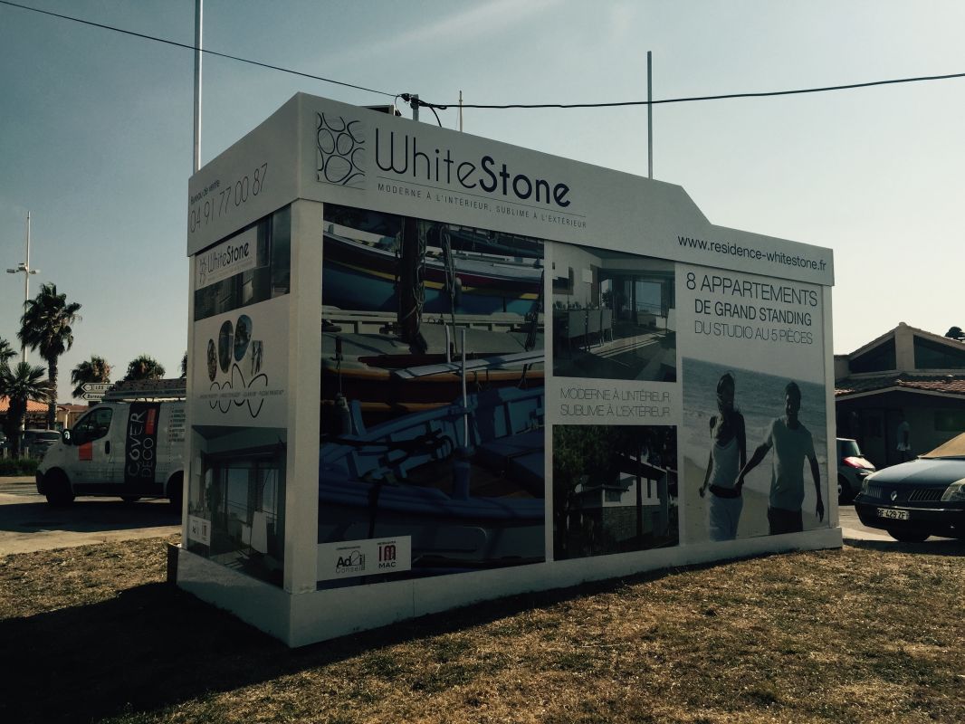 Pour White Stone, nous avons réalisé un habillage avec une structure en panneaux dibond, sur laquelle nous sommes venus contrecoller des adhésifs en impression numérique.