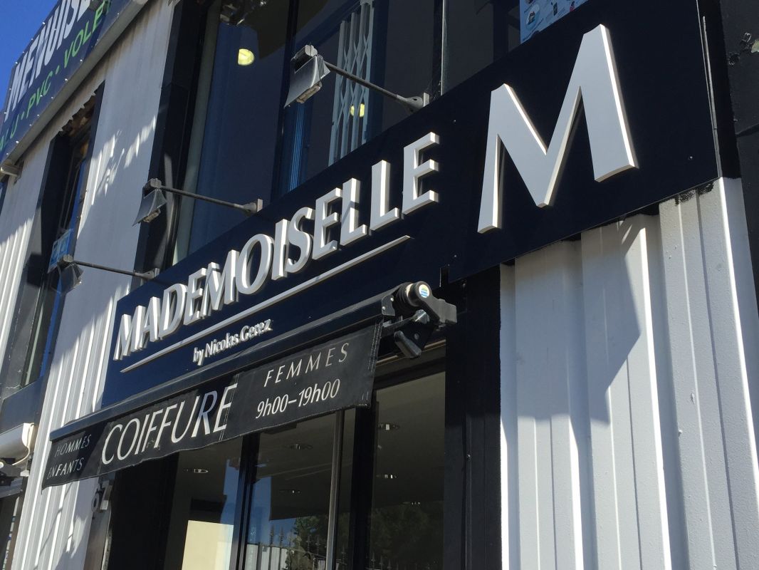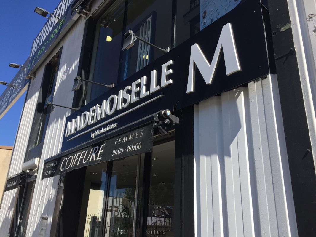 Pour ce salon de coiffure situé dans la zone industrielle des paluds à Aubagne, nous avons réalisé une enseigne avec lettres reliefs découpées en PVC 20 mm.