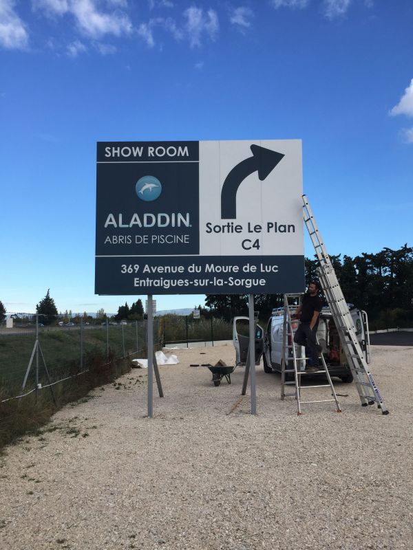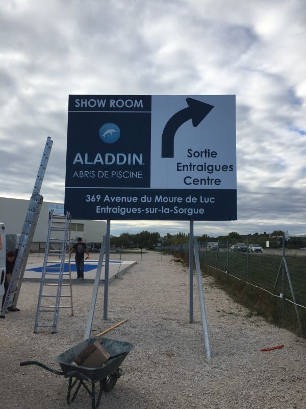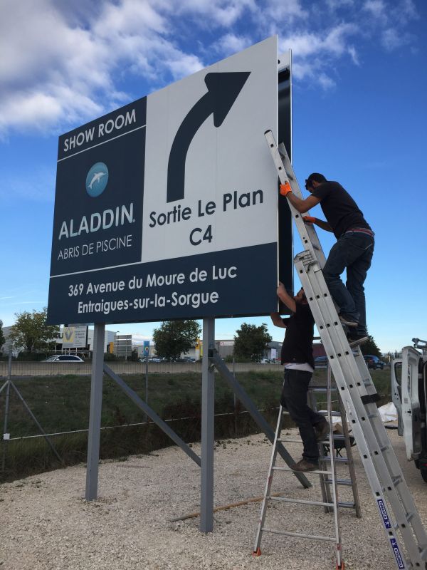 Pour une entreprise de matériel de piscine, les équipes de Coverdéco ont installé deux panneaux de 4x3 recto/verso.