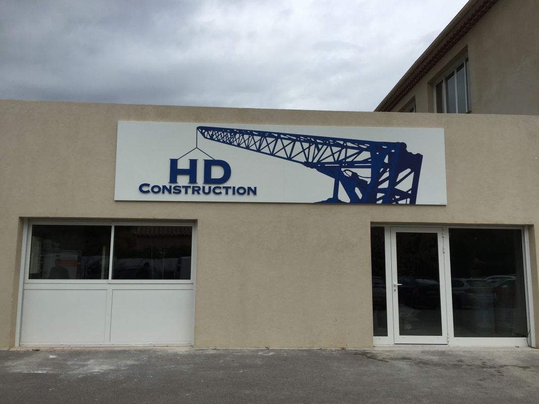 L'enseigne de notre client HD Construction est composé de deux panneaux en prélaqué en blanc avec bords pliés.