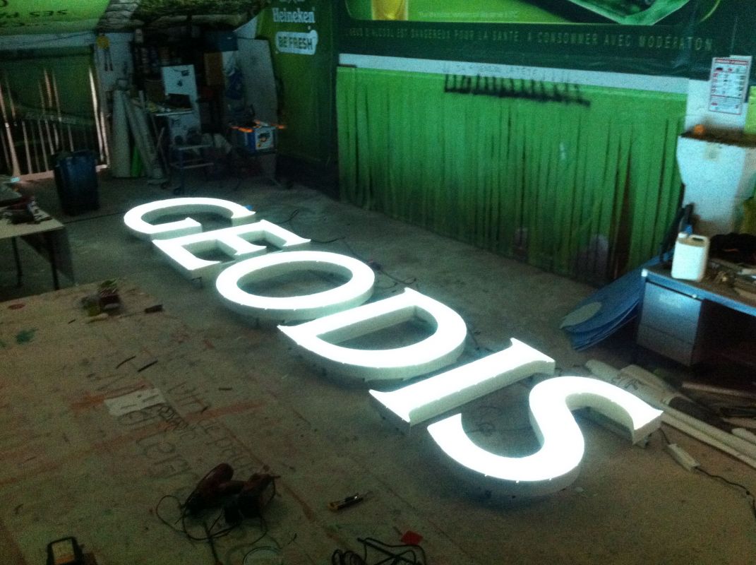 Ce projet comprends des lettres boitiers avec faces plexiglas diffusant et éclairage intérieur par leds, et d'un caisson lumineux avec en face avant une bâche "back-light" tendue, éclairé par tubes fluos.