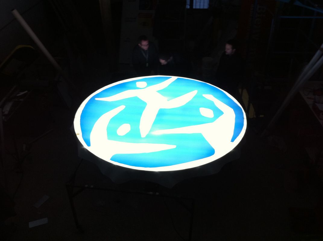 Pour la réalisation de ce caisson, nous avons cintré les profilés sur mesure pour obtenir le rond du logo.