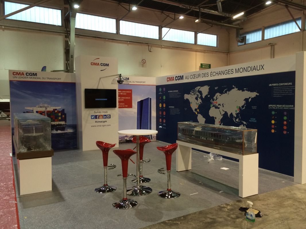 Pour la CMA CGM, nous avons réalisé un stand sur mesure . Nous avons construit des cloisons habillées d'adhésif qui représentent le leader mondial du transport.